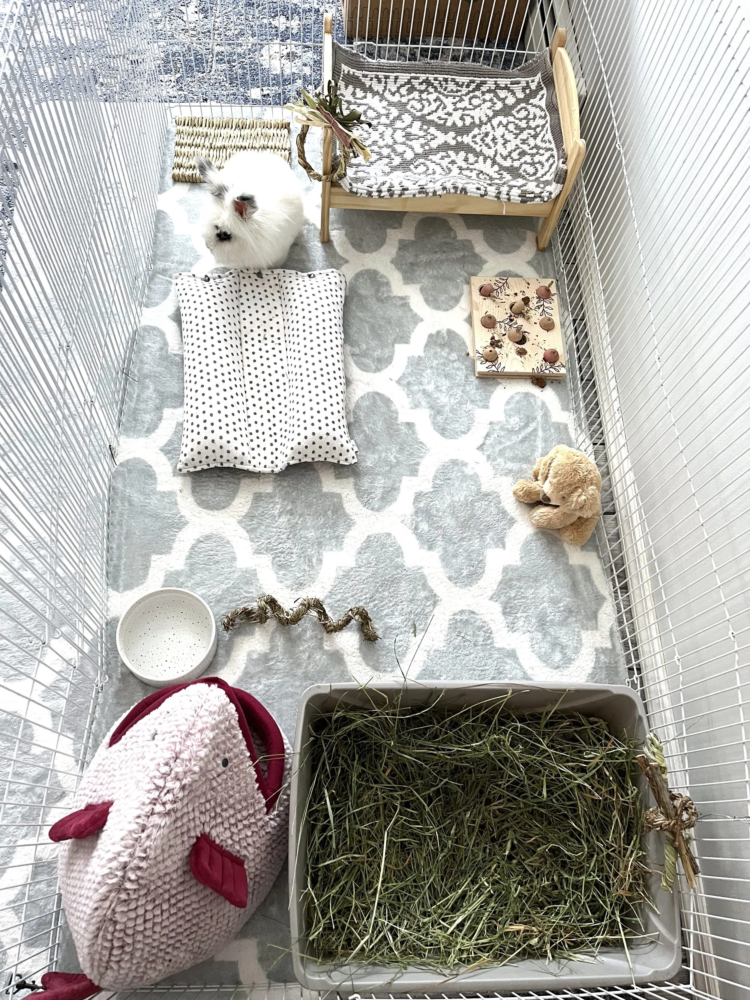 Providing your rabbit with an enjoyable and safe home base in the form of a puppy pen is one of the best things you can do for them. Outfit the pen with a rug for traction, as you should elsewhere where they play. Add a generously sized litter box filled with fresh timothy hay, cleaned regularly and topped off daily. Don’t be timid about the size of the litter box — it’s not only where they will defecate, but it also serves multiple other functions. It’s a recreational space for them to graze and dig, and it encourages them to eat more hay during the day. It’s like simulating a meadow right in your home — the bigger, the better.
